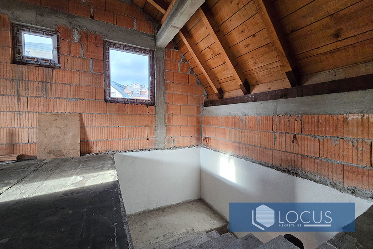 Na prizemlju se nalazi veliki poslovni prostor sa dva toaleta I ostavom i garaža. Prvi sprat je odmah useljiv, trenutno se koristi i sastoji se od dnevnog boravka u kombinaciji sa kuhinjom i trpezarijom, spavaće sobe, kupatila, balkona i hodnika. Etaže drugog sprata i potkrovlja su u roh bau stanju tako da je budućim vlasnicima ostavljena mogućnost finalnog uređenja i organizacije prostora u skladu sa ličnim potrebama. Bitno je napomenuti da se kuća nalazi u pristupačnom okruženju pogodnom za porodični život. U blizini se dostupni sadžaji kao što su trgovački i ugostiteljski objekati, pekara, apoteka, dječiji vrtić, itd.